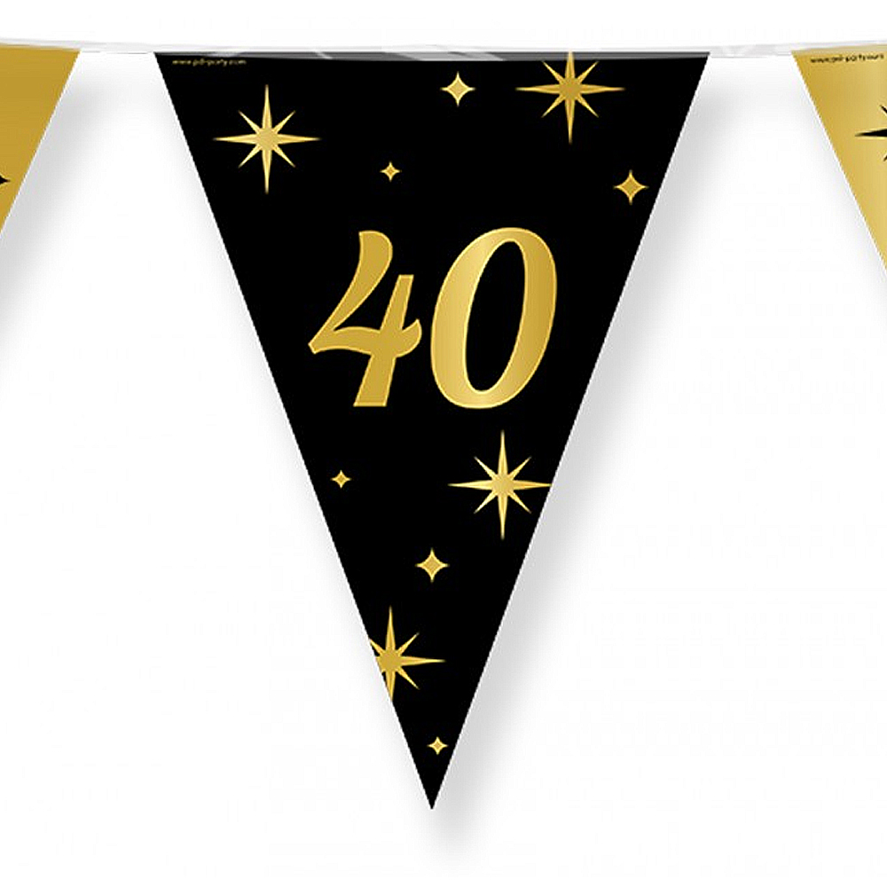 Fêtes-tu bientôt ton 40e anniversaire ? Rends ta fête d’anniversaire encore plus festive avec cette magnifique guirlande de fanions noire et dorée ! La guirlande a un design chic, est faite de matériau en feuille de haute qualité et mesure 10 mètres de long.