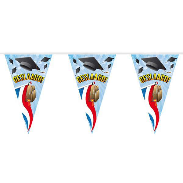 Avec cette guirlande de drapeaux, faites de votre fête de réussite un moment inoubliable! La guirlande mesure 10 mètres de long et est fabriquée en PVC solide. Elle est composée de 20 petits drapeaux de 29 x 20 cm (L x l). Sur la guirlande figure le texte ‘Réussi!’ avec des mortiers de graduation en arrière-plan, et un drapeau néerlandais avec mât et sac à dos. Avec cette guirlande colorée, votre fête de fin d’études sera complète!