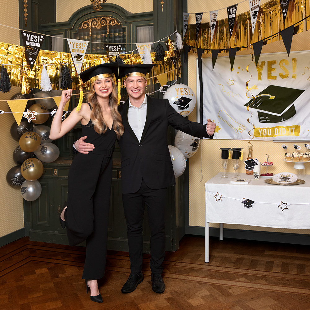 Quelqu’un a réussi ? Alors, des ballons festifs pour féliciter le diplômé ne peuvent bien sûr pas manquer ! Avec ce lot de 6 ballons en latex, vous donnez immédiatement une ambiance joyeuse et élégante à une remise de diplôme, une fête d’examen ou une fête de fin d’études. La combinaison de blanc, noir et or crée un ensemble festif qui correspond parfaitement à un moment particulier comme la réussite, l’obtention d’un diplôme ou la fin d’études.
