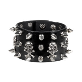 Ce bracelet présente un modèle large et est richement orné de pointes argentées, de studs décoratifs et de plusieurs têtes de mort. Cet accessoire affiche ainsi un style affirmé, parfait pour les tenues de festival, les fêtes à thème, le carnaval ou les looks inspirés du rock. Même dans une tenue plus décontractée, ce bracelet punk apportera instantanément davantage de caractère.