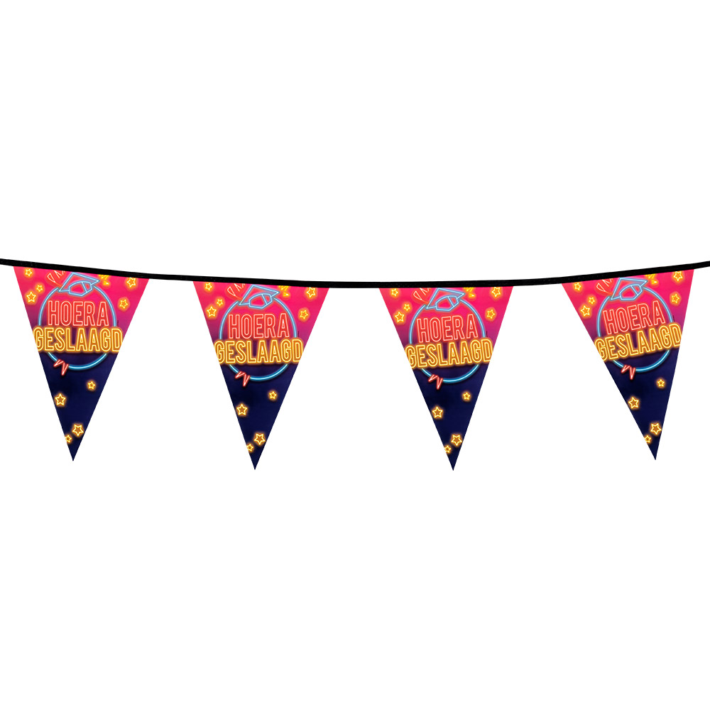 Le design combine le texte « Hoera geslaagd » avec un motif néon joyeux. La guirlande est fabriquée en polyéthylène et est imprimée sur une seule face. Le matériau léger rend la guirlande facile à accrocher et pratique à utiliser. Accrochez-la à la maison, à l’école ou dans une salle de fête et rendez ce moment de réussite encore plus mémorable.