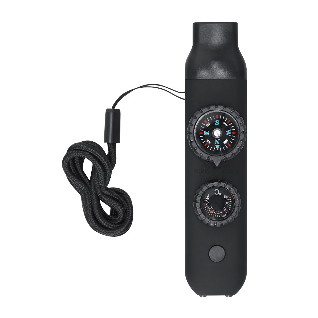 - 6 Fonctions : Boussole, Sifflet de secours, Thermomètre, Loupe, Miroir, Lampe de poche
