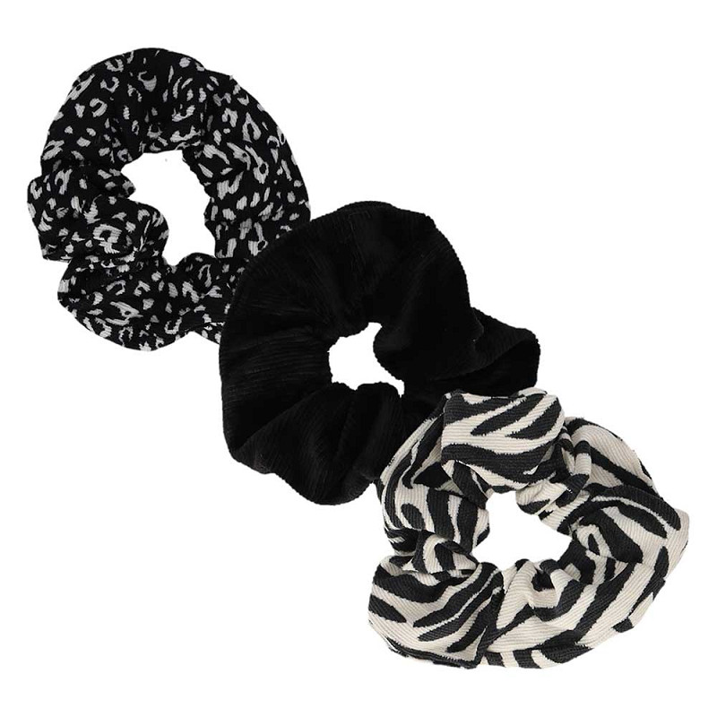 Cet ensemble se compose de trois chouchous dans une élégante combinaison de noir et blanc avec un motif zèbre. Les imprimés animaliers sont depuis des années populaires dans la mode et les accessoires, apportant une touche ludique et branchée à une tenue.