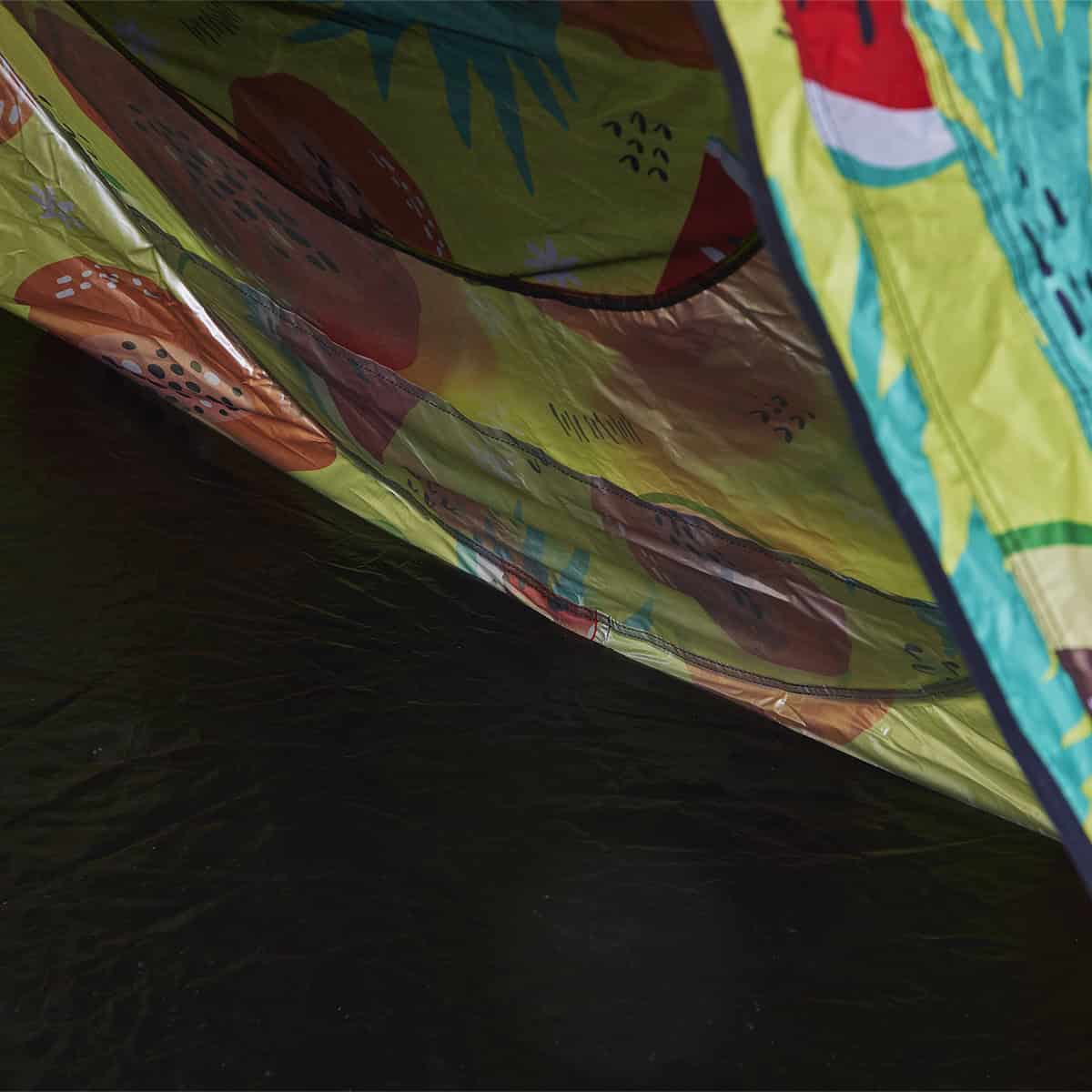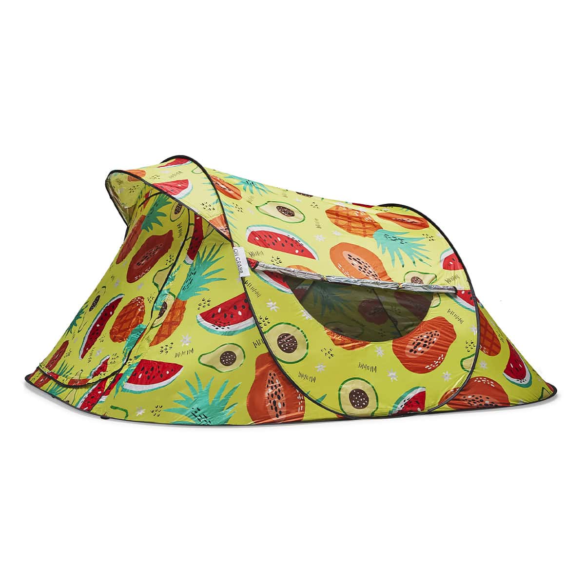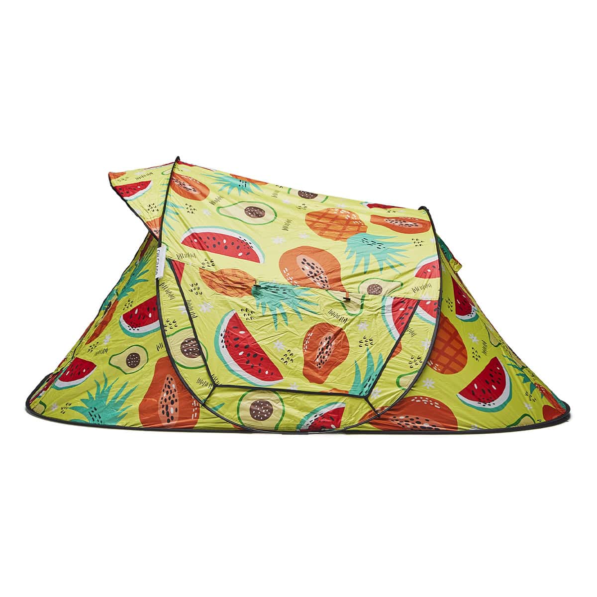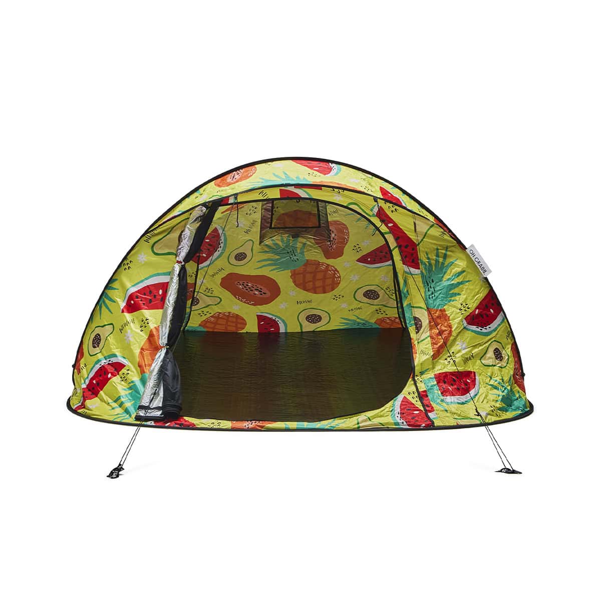 Tu pars bientôt camper dans un festival ? Alors cette tente pop-up Fraîche & Fruité de Oh Crabb est un indispensable parmi ton équipement de camping ! La tente a un motif fruité amusant, qui te fera bien ressortir sur le camping. Grâce au système pop-up simple en 2 secondes, la tente se dresse en 2 secondes ! Il ne te reste plus qu’à la fixer. La tente est adaptée pour 2 à 3 personnes et peut accueillir 2 matelas pneumatiques simples, 1 matelas pneumatique double ou 3 matelas de couchage tout en laissant de la place pour ranger tes bagages. La toile de la tente est fabriquée en polyester 190T avec une colonne d’eau de 2000mm et une protection UV de 30%. Le sol de la tente est en polyéthylène 120gsm et est également étanche, avec une colonne d’eau de 2400mm, donc ta tente est résistante à une forte averse hollandaise. Le cadre est en fibre de verre robuste, ce qui rend la tente extra solide et stable. La tente mesure 253 x 215 x 100 cm (L x l x H). Il y a donc suffisamment d’espace pour 2 à 3 personnes et encore de la place pour ranger tes bagages. Avec une hauteur de 100 cm, tu as aussi assez d’espace pour t’asseoir droit dans la tente. À l’intérieur de la tente, il y a deux poches en mesh pour ranger de petits objets et les côtés de la tente comportent des panneaux de ventilation naturelle.