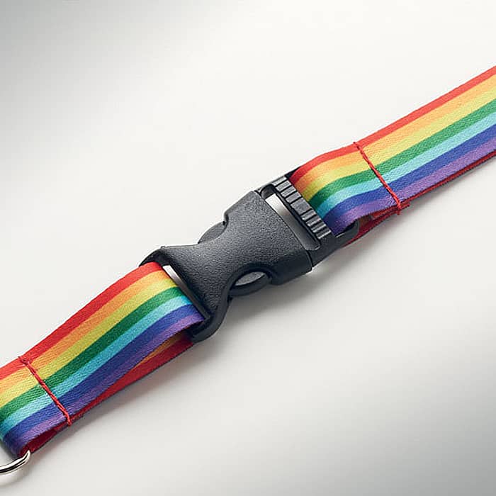 Accrochez facilement vos clés, badges, cartes ou autres accessoires à cette jolie lanière arc-en-ciel et conservez-les en toute sécurité ! La lanière est fabriquée en RPET et dispose d’un crochet en métal, d’un clip détachable et d’un fermoir de sécurité au niveau du cou. Une manière joyeuse et colorée de conserver vos accessoires. Vous ne passerez pas inaperçu avec ce cordon autour du cou !