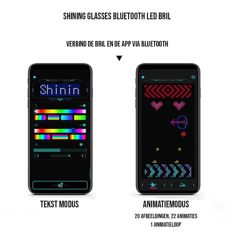 Avec ces lunettes LED Bluetooth de haute technologie de Shining Glasses, vous programmez vous-même votre propre texte, image ou animation ! Des lunettes uniques pour se démarquer lors de tout événement. Personnalisez votre texte, image ou animation avec l’application associée ‘Shining Glasses’ (IOS & Android) ou utilisez l’une des 22 animations prédéfinies ou 20 images prédéfinies. Vous pouvez également définir une option d’égaliseur qui réagit à la musique de votre téléphone ou à la musique de votre environnement ou utiliser le mode DIY pour concevoir quelque chose entièrement vous-même ! Changez facilement entre les différentes animations grâce au bouton sur les lunettes. Les possibilités sont infinies ! Sur le masque se trouve un bouton marche/arrêt. En maintenant le bouton enfoncé, vous allumez et éteignez les lunettes, et en appuyant brièvement, vous pouvez changer entre les différentes animations. Pour afficher vos créations personnalisées sur les lunettes, activez l’application et connectez-vous via Bluetooth, vous pourrez ainsi connecter vos lunettes. Grâce au pont nasal, les lunettes restent bien en place et grâce aux ouvertures pour les yeux, vous pouvez voir parfaitement où vous marchez pendant que vous portez les lunettes. Après utilisation, vous pouvez facilement ranger les lunettes dans la pochette fournie. Les lunettes fonctionnent avec un câble USB avec micro USB (inclus) et sont la tendance du moment en matière de gadgets de festival !
