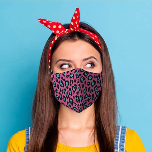 Masque avec imprimé panthère rose. Masque en tissu à deux couches lavable et réutilisable avec des boucles d’oreilles en caoutchouc et un imprimé amusant. L’extérieur est fabriqué à 100 % en polyester et l’intérieur en coton 100 % confortable avec des tissus OEKO-TEX.