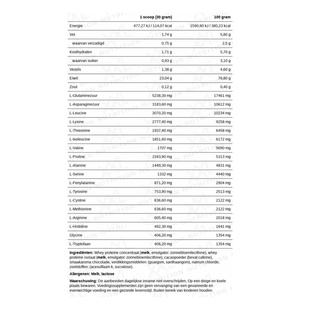 Concentré de protéines de lactosérum (lait, émulsifiant : lécithine de tournesol), isolat de protéines de lactosérum (lait, émulsifiant : lécithine de tournesol), poudre de cacao (contient de la caféine), arôme chocolat, épaississants : (gomme de guar, gomme xanthane), chlorure de sodium, édulcorants : (acésulfame K, sucralose)